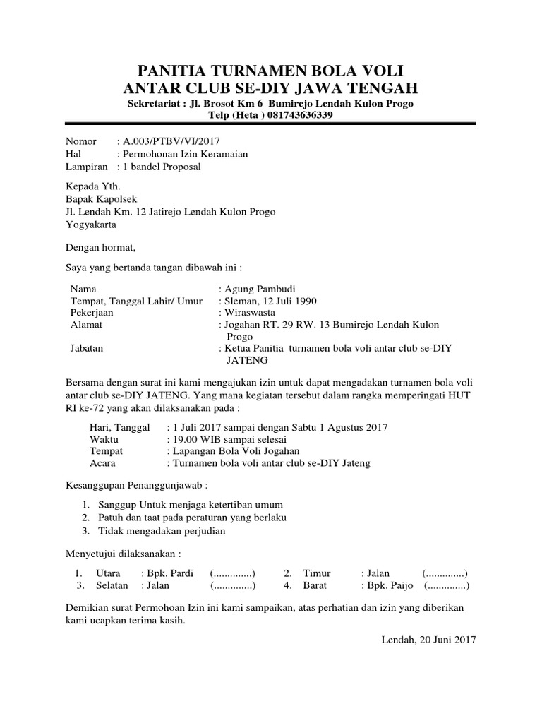 Contoh Surat Permohonan Izin Tempat Kegiatan 9n0k7p9om24v from idoc.pub Surat izin keramaian adalah surat yang dibuat oleh pihak perseorangan maupun kelompok/lembaga/instansi resmi yang berisikan permohonan izin untuk mengadakan suatu kegiatan yang ditujukan kepada kepolisian. Contoh surat izin berikut dapat digunakan untuk meminta persetujuan dari orang tua, apakah anaknya diperbolehkan ikut atau tidak. Contoh surat izin adalah sebuah surat yang dibuat dengan tujuan untuk meminta izin kepada penerima bahwa sang pengirim memiliki hajat / acara tertentu sehingga tidak bisa hadir atau melaksanakan kegiatan seperti biasanya. Contoh surat izin kegiatan osis di sekolah lengkap , aia rashisa !: Copyright download as docx, pdf, txt or read online from scribd. Surat izin tidak dapa t mengikuti kegia tan. Download kumpulan contoh lengkap mengenai contoh makalah laporan kegiatan pdf secara gratis disini termasuk tulis contoh surat lamaran kerja simple, surat izin usaha lingkungan, surat resign contoh surat pengunduran diri hotel, dan masih banyak contoh lain yang berkaitan dengan contoh. Pengajuan izin pada lembaga resmi biasanya tidak dilakukan secara mendadak.